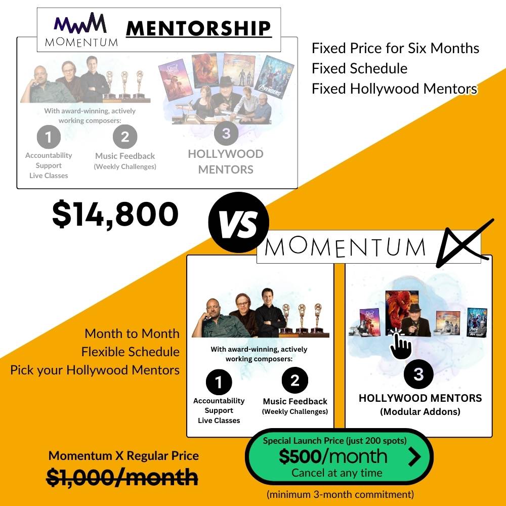 - MOMENTUM X: While you have a set group of award-winning and actively working composers that work with you every week, there is also a series of workshops with Hollywood Composers that are optional add-ons. This drastically reduces the price of the program, while you still have access to this one-of-a-kind mentoring opportunities.